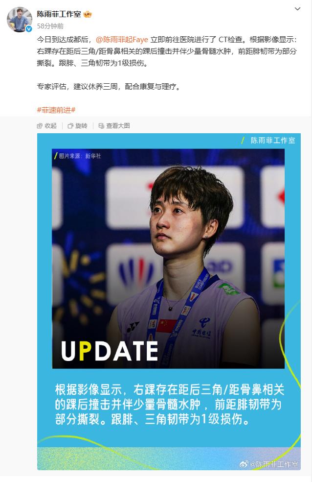 今日到达成都后,@陈雨菲起Faye立即前往医院进行了 CT检查。根据影像显示:右踝存在距后三角/距骨鼻相关的踝后撞击并伴少量骨髓水肿,前距腓韧带为部分撕裂。跟腓、三角韧带为1级损伤。