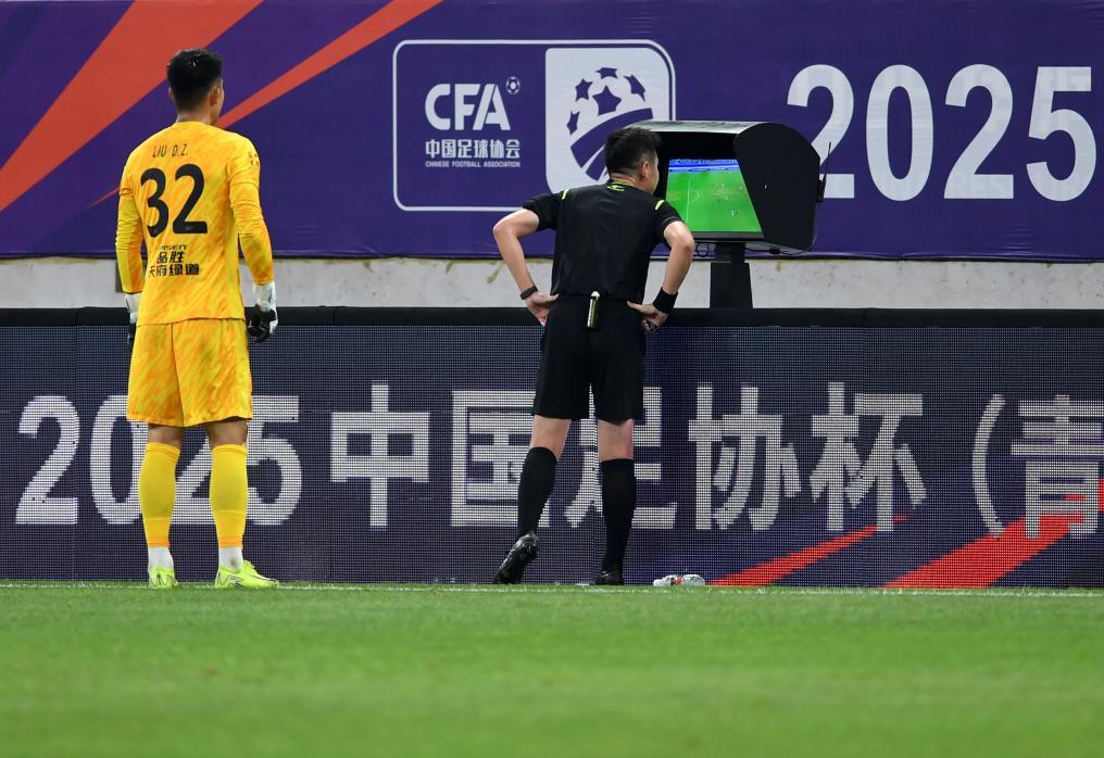 7月23日,在山东青岛进行的一场2025中国足协杯四分之一决赛中,主裁判查看VAR。新华社记者 李紫恒 摄这位意大利著名裁判在这里举行的世界足球峰会上作了上述表示。他说:“足球似乎已经离不开VAR,现在世界上所有重要的比赛都采用了这项技术。”