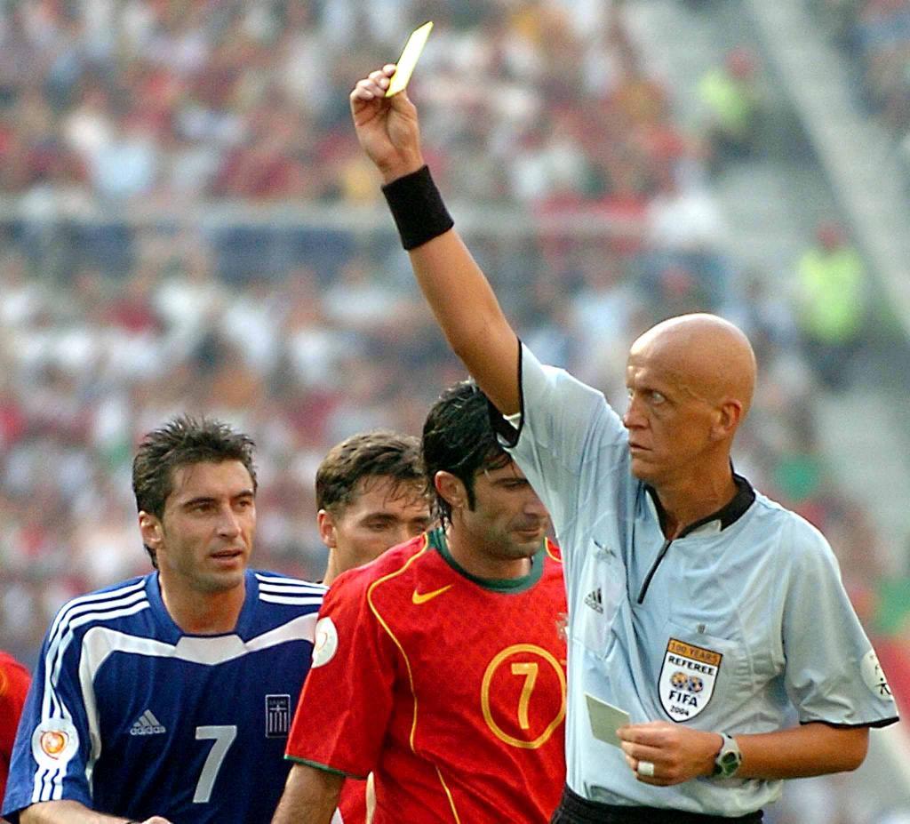 资料:2004年6月12日,科里纳(右一)在比赛中执裁。新华社记者 戚恒 摄他说:“我不后悔任何判罚,因为我总是竭尽全力。当你尽力之后,你必须接受一些事情的不好后果,这对每个人来说都很正常。我们都是人,只要是人就会犯错。”