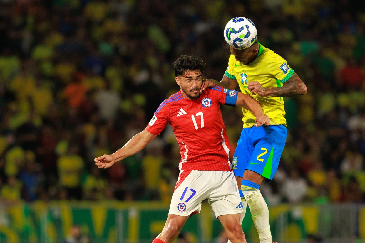 9月4日,巴西队球员韦斯利(右)与智利队球员苏亚索在比赛中争顶。新华社发(克劳迪娅·马尔提尼摄)