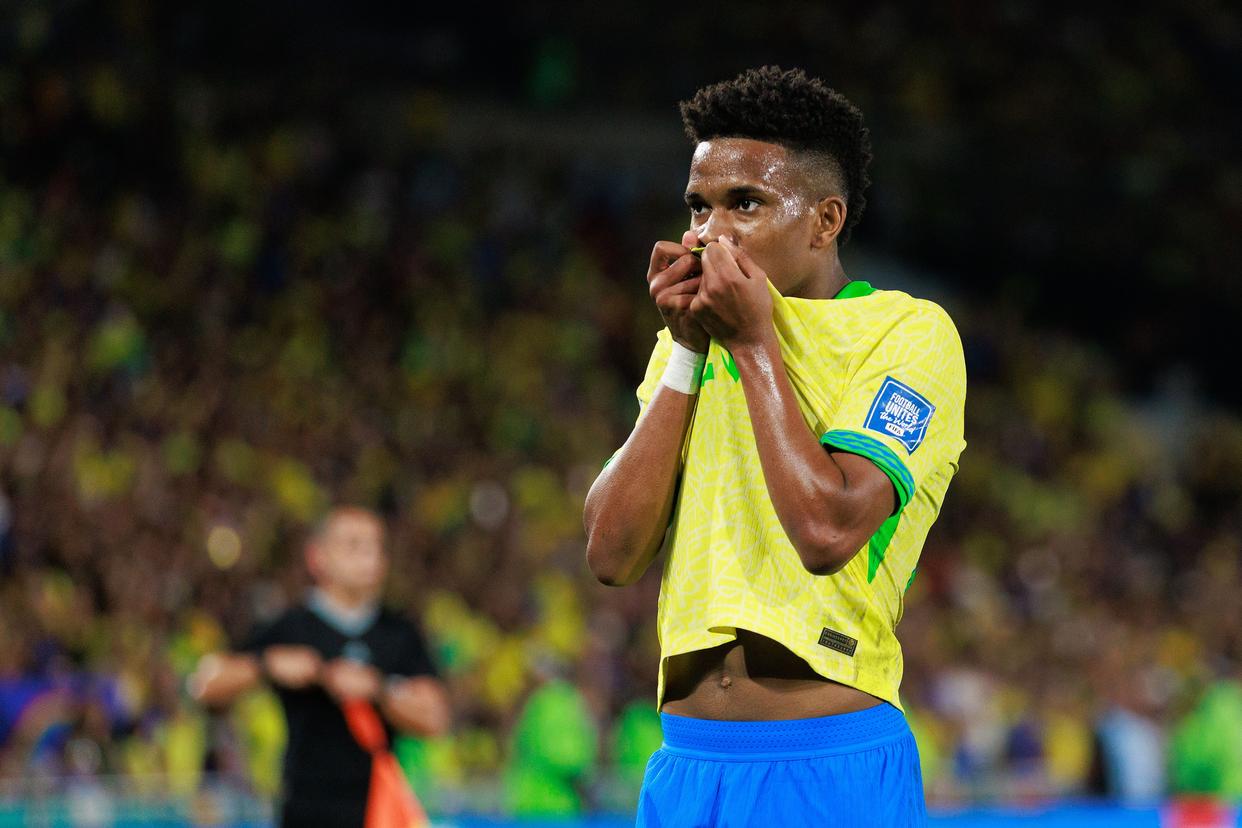 9月4日,巴西队球员埃斯特旺在进球后庆祝。新华社发(克劳迪娅·马尔提尼摄)