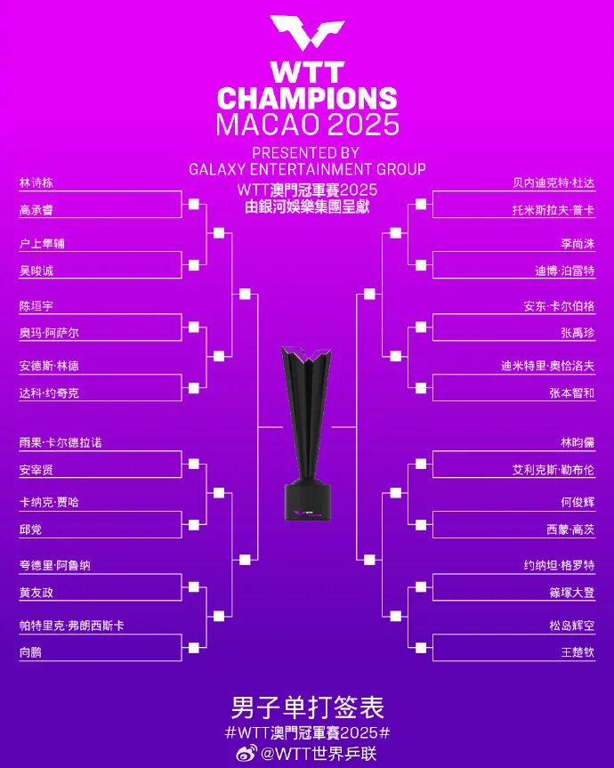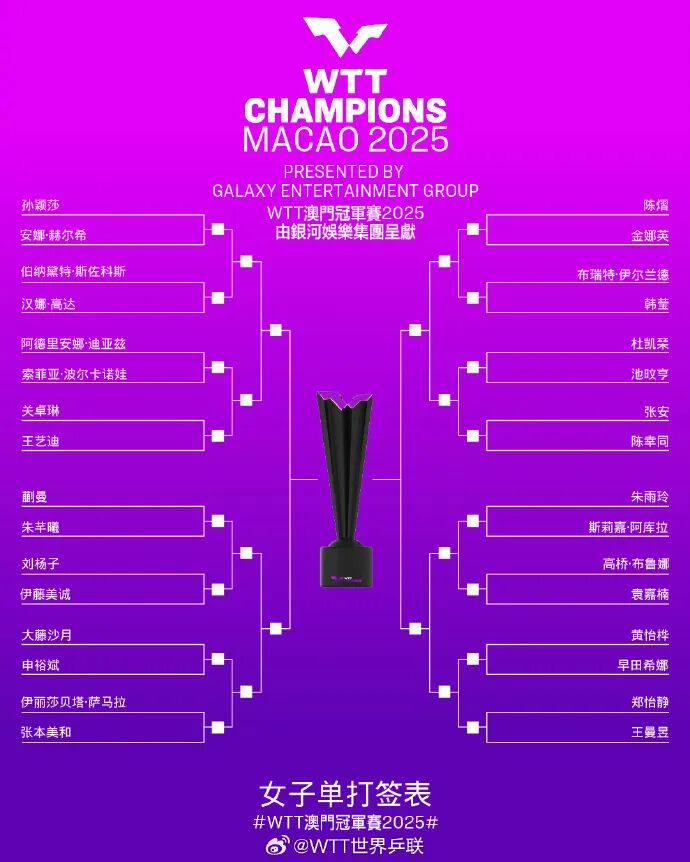 9月7日,WTT澳门冠军赛2025抽签全部出炉,国乒首轮对阵如下: