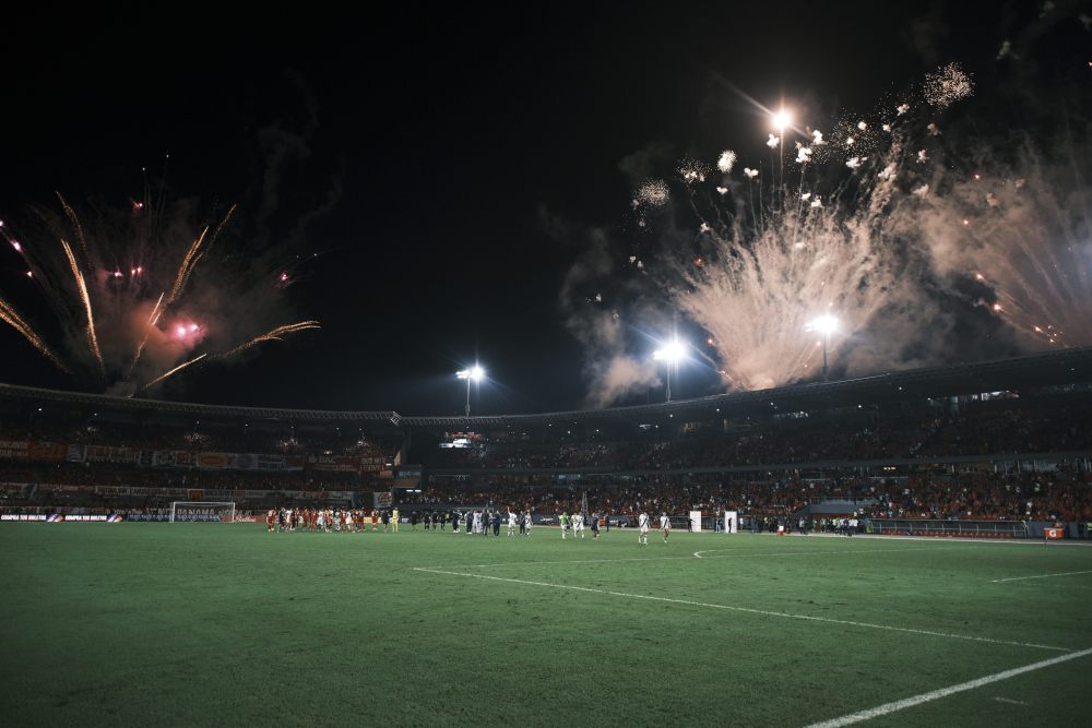 9月8日,比赛结束后,球场外燃放烟花庆祝。新华社记者 许咏政 摄