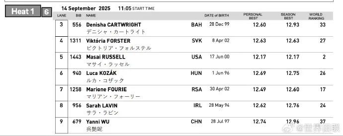 2025东京田径世锦赛女子100米栏预赛分组已公布。中国选手吴艳妮被分在第一组第9道,同组有巴黎奥运会冠军马塞·拉塞尔。吴艳妮将于北京时间9月14日10时05分出战。