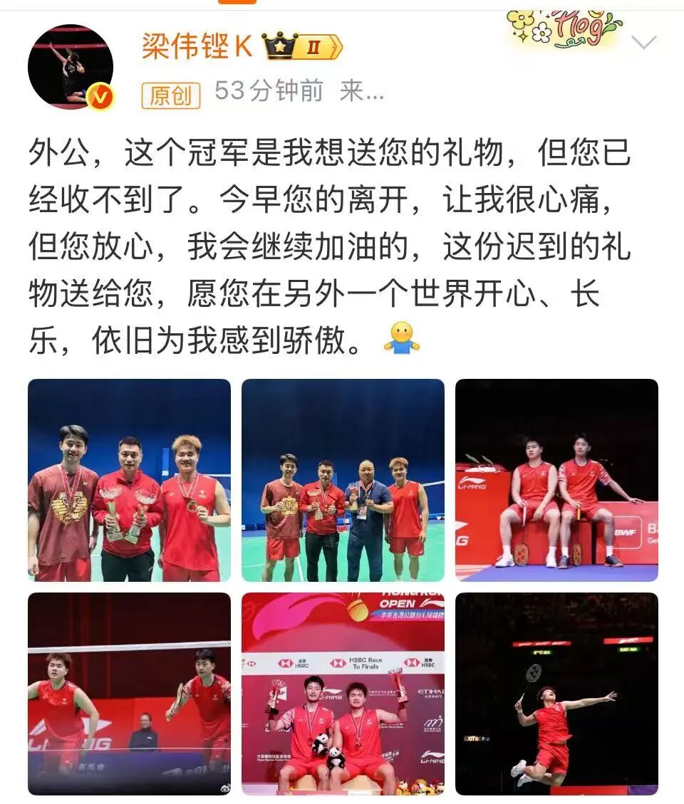 外公,这个冠军是我想送您的礼物,但您已经收不到了。今早您的离开,让我很心痛,但您放心,我会继续加油的,这份迟到的礼物送给您,愿您在另外一个世界开心、长乐,依旧为我感到骄傲。