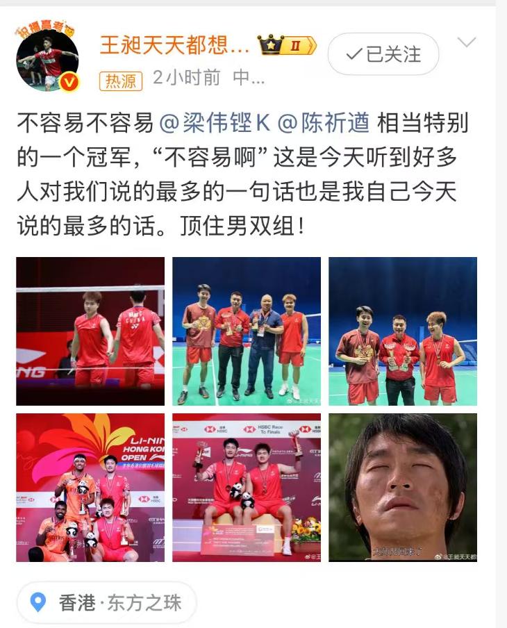 王昶连说三个不容易:不容易不容易@梁伟铿K@陈祈遒 相当特别的一个冠军,“不容易啊”这是今天听到好多人对我们说的最多的一句话也是我自己今天说的最多的话。顶住男双组!