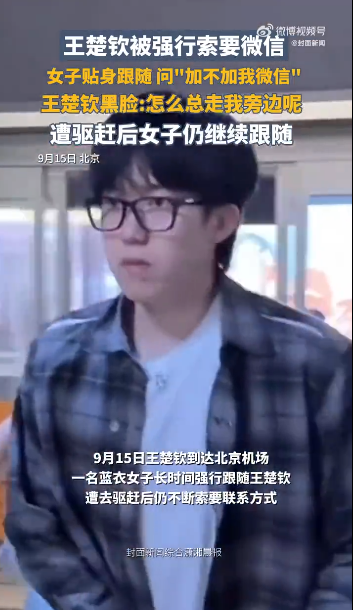 9月15日,王楚钦抵达北京机场,一名身穿蓝色衣服的女子,长时间贴身尾随,强行与其并排行走。王楚钦当场冷脸表示:“干嘛总走我边上?”该女子仍继续跟随还追问:“加不加我微信?以后联系联系”,网友直呼“行为疯狂”。