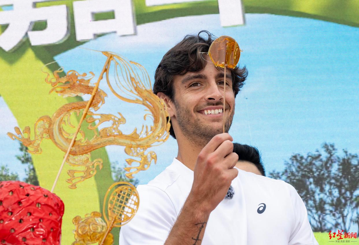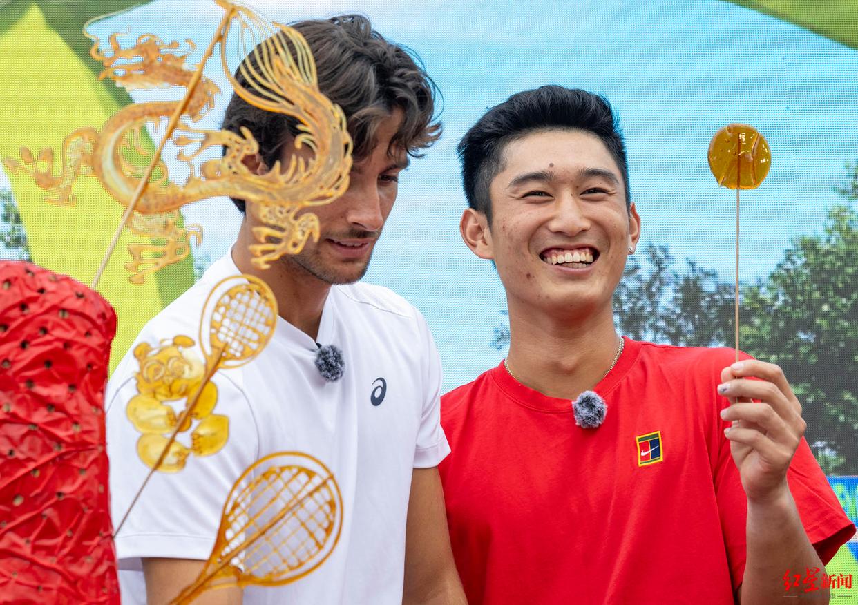 此后,两位网球高手变身“学徒”,学习起了成都传统非遗技艺——画糖画。这项好吃又好玩的非遗技艺,让两位选手大感兴趣。在糖画老师手把手的指导下,商竣程很快完成了自己的作品,一个糖饼。穆塞蒂倒是非常大气,自己拿起勺子就“画”了起来,又是一个糖饼。他们分别举起自己的糖饼作品展示,球迷们在欢呼中为他们打出了“平手”的比分。