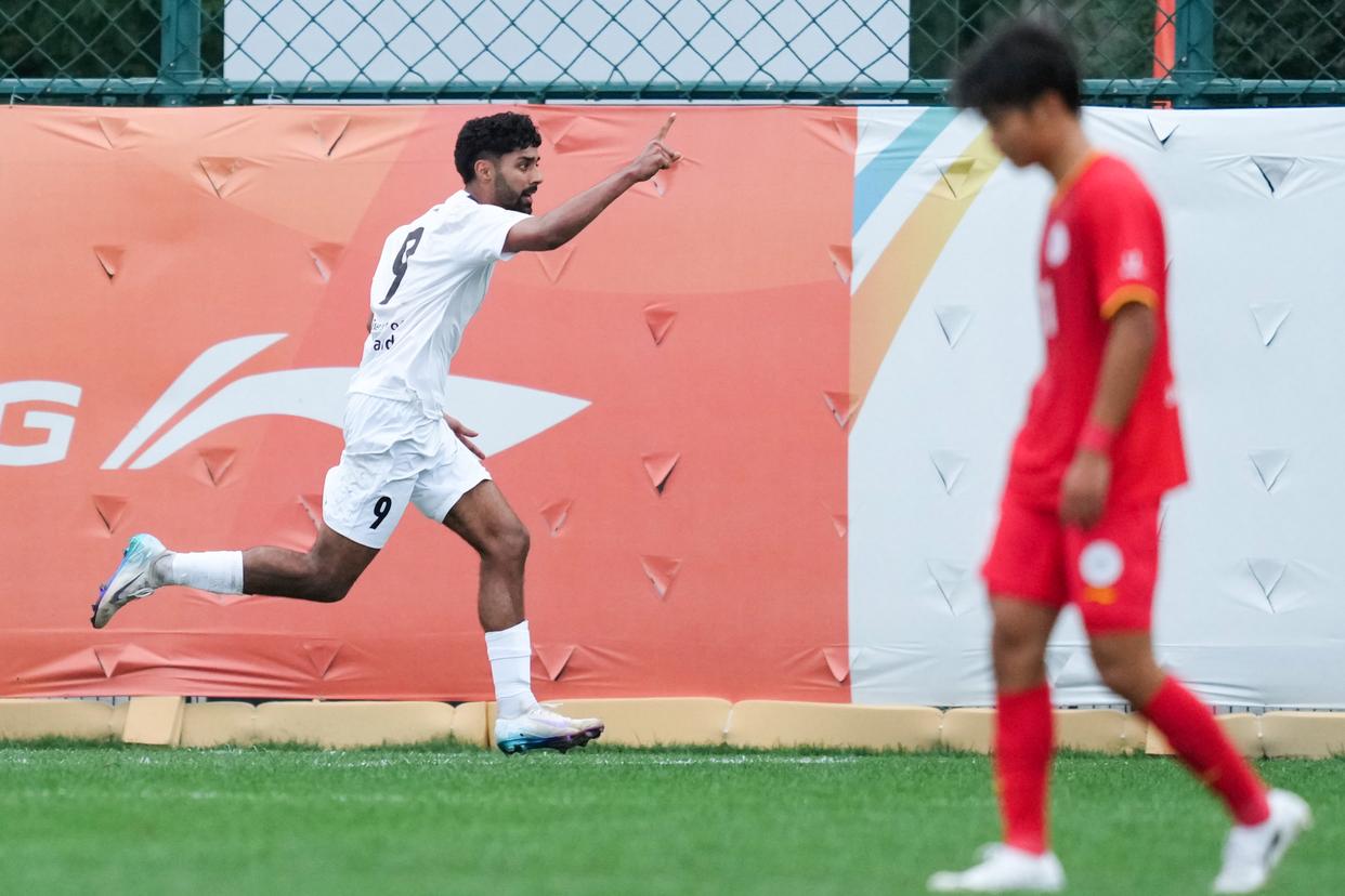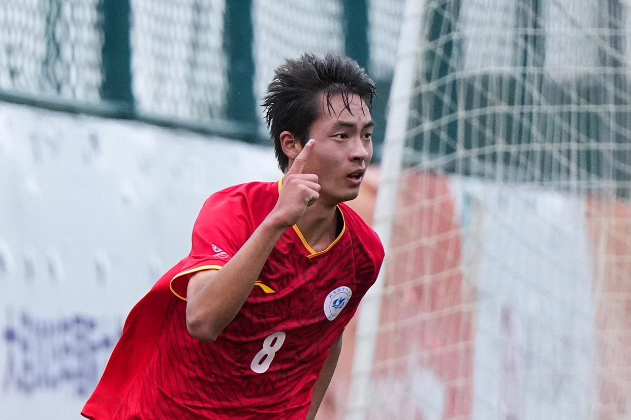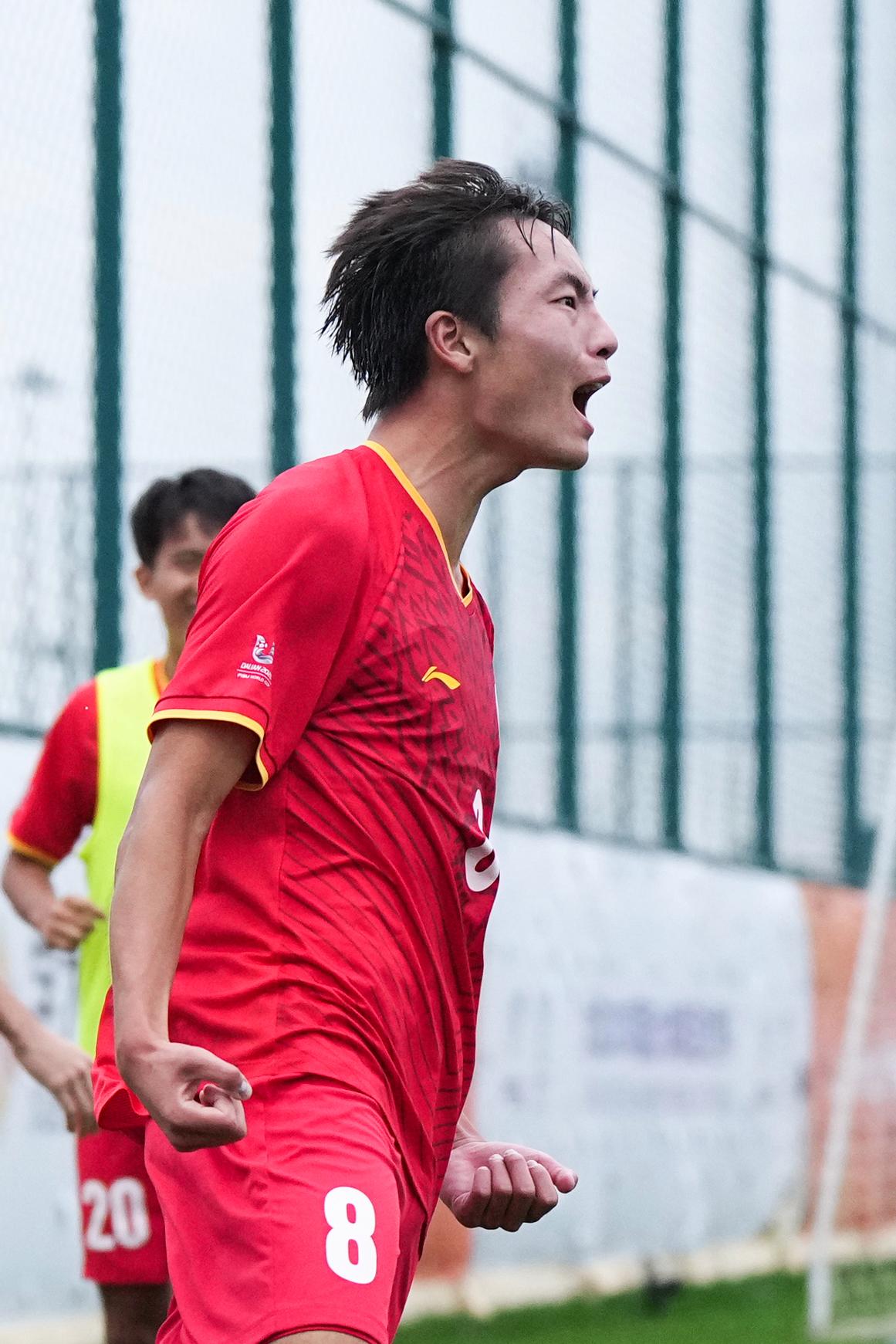 9月22日,北京航空航天大学队球员程曦阳在比赛中庆祝进球。新华社记者 郑焕松 摄