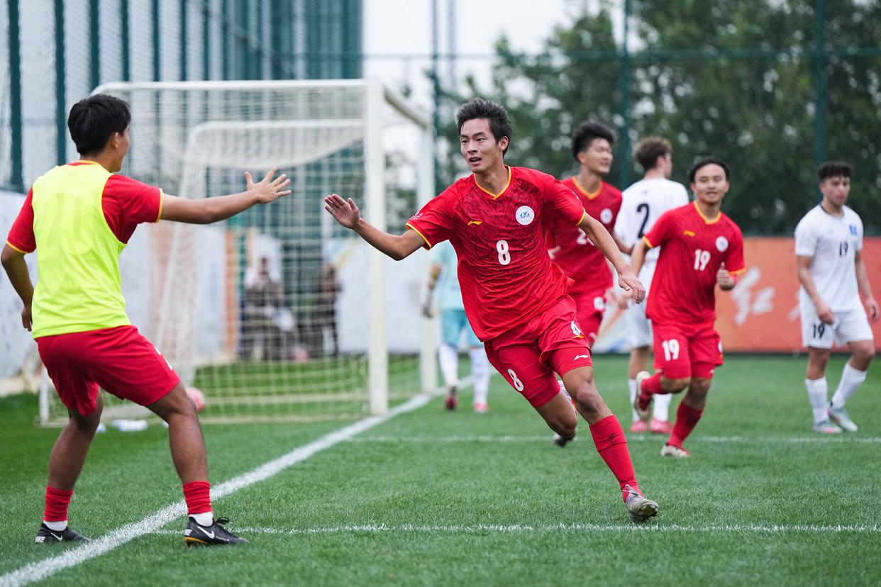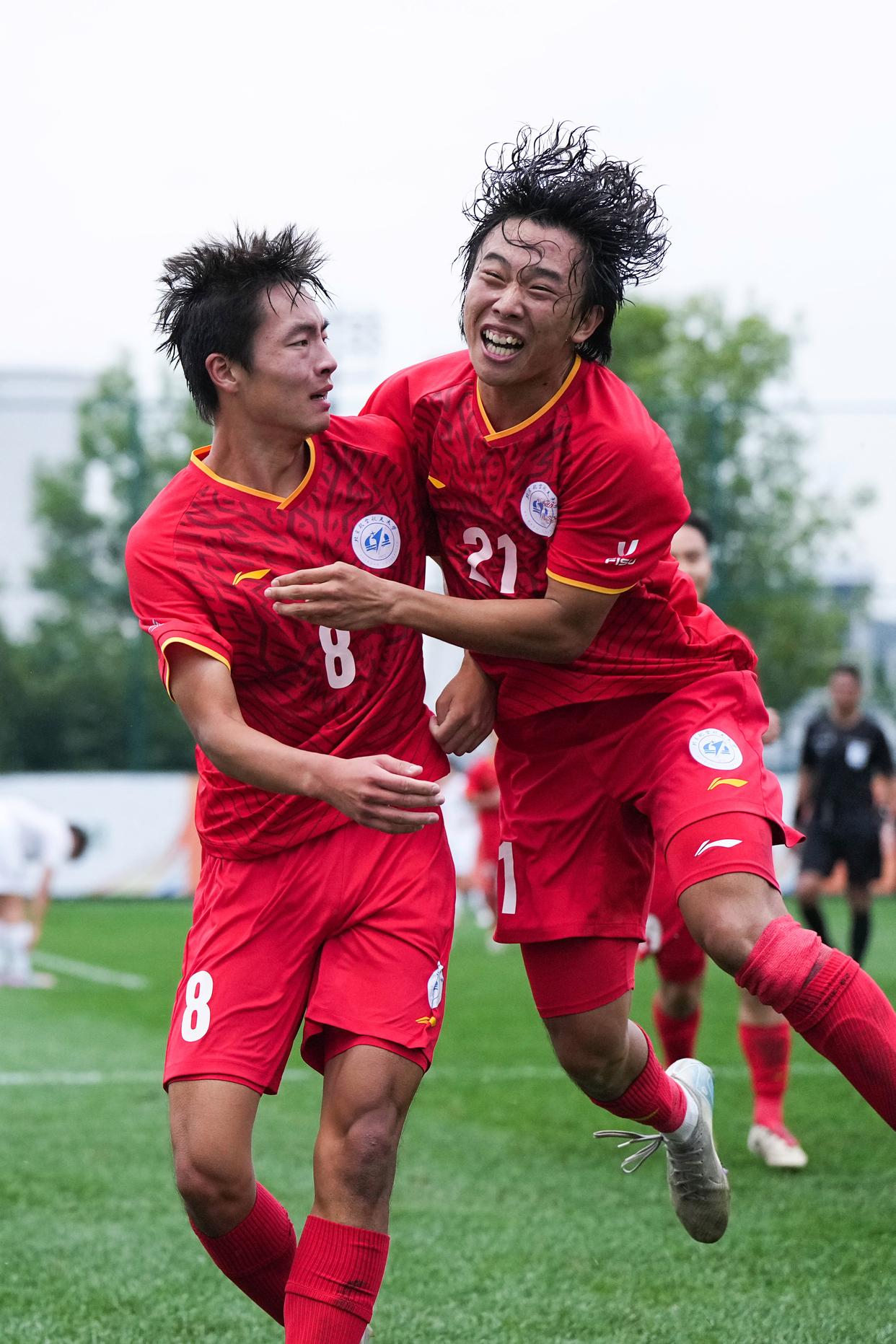 9月22日,北京航空航天大学队球员程曦阳(前右)在比赛中庆祝进球。新华社记者 郑焕松 摄