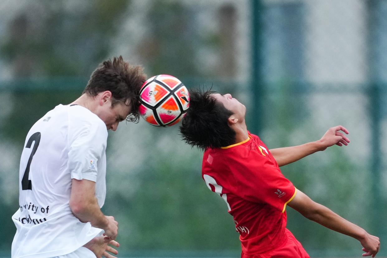 9月22日,奥克兰大学队球员迪隆(上右)在比赛中头球攻门。新华社记者 郑焕松 摄