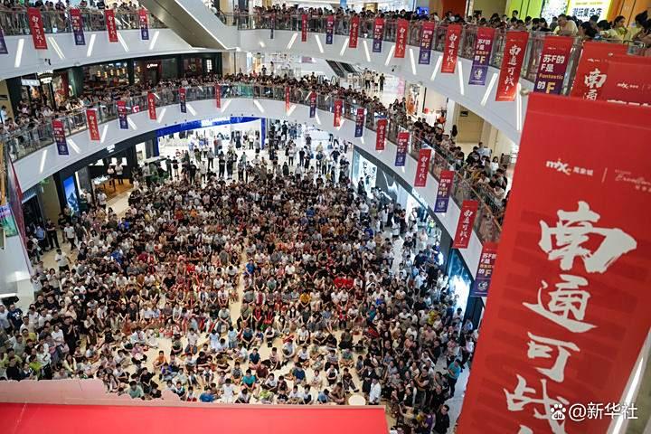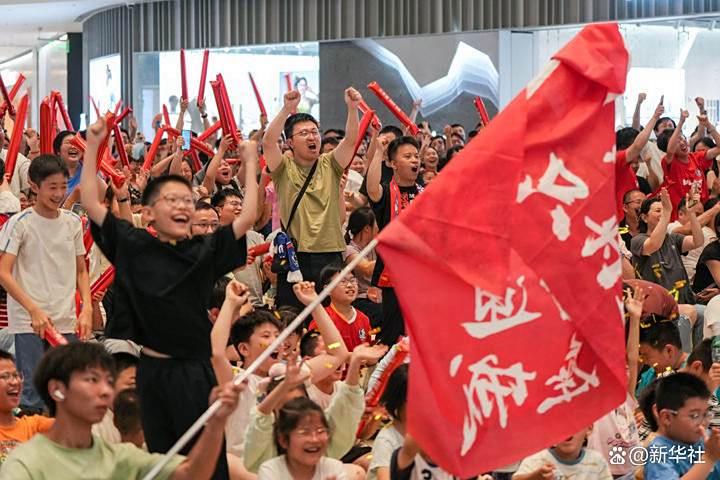 ↑2025年6月29日,“苏超”(2025江苏省城市足球联赛)第五轮南通队坐镇主场对阵宿迁队,市民、球迷在南通市内一处商场观看比赛直播,为球队加油呐喊。 新华社记者 李博 摄