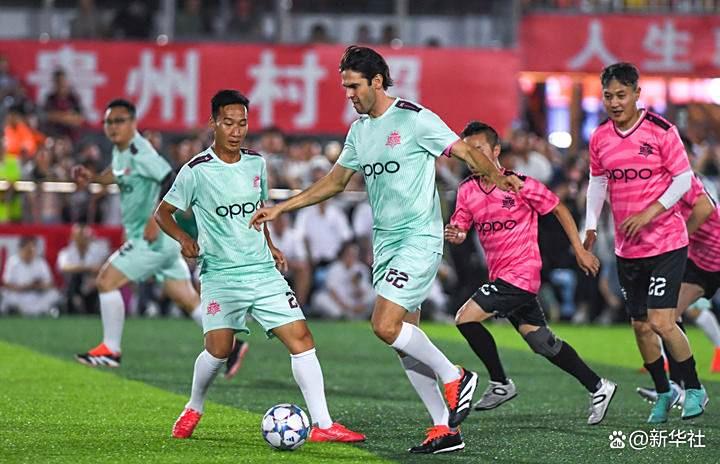 ↑2024年5月27日,“逐梦”冠军公益赛在贵州省黔东南苗族侗族自治州榕江县“村超”球场举行。本次公益赛包括“逐梦”冠军青少年女足公益赛与“逐梦”冠军明星公益赛,巴西足球名宿卡卡等亮相球场。 新华社记者 杨文斌 摄