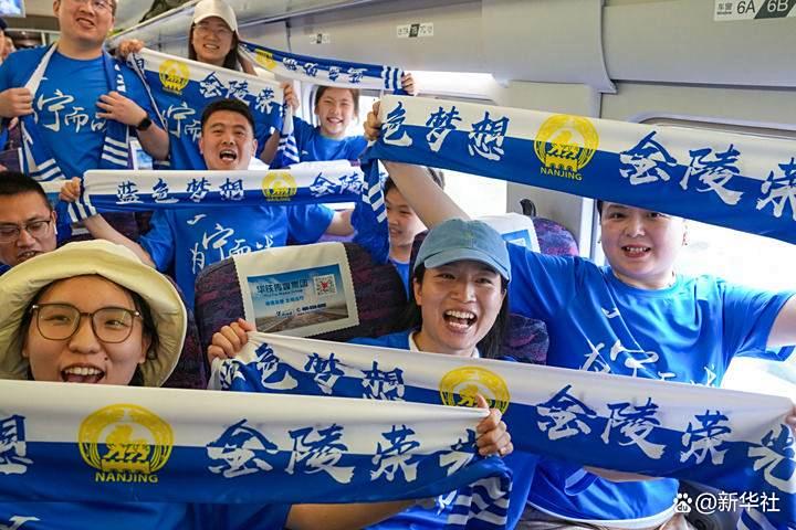 ↑2025年6月14日,球迷们在G9253次列车上合影留念。 当日,2025年江苏省城市足球联赛第4轮淮安队对阵南京队的比赛在江苏省淮安市举行,铁路部门开行南京站往返淮安东站的长三角首趟“苏超”球迷高铁专列,方便南京球迷前往观赛。 新华社记者 李博 摄
