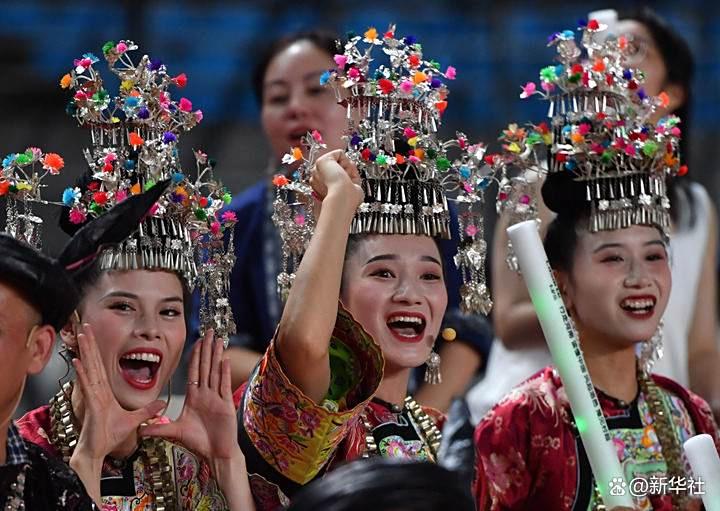 ↑2024年9月7日,洛邑古城队与贵州村超队足球友谊赛在河南省洛阳市举行。这是身着民族服饰的观众在场边加油助威。 新华社记者 李嘉南 摄
