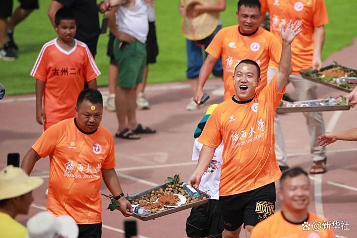 ↑2023年8月13日,贵州榕江美食足球友谊赛(第一季)在贵州省榕江县开赛,广西大学甘蔗汁队球员在入场时展示当地美食。新华社记者 刘续 摄