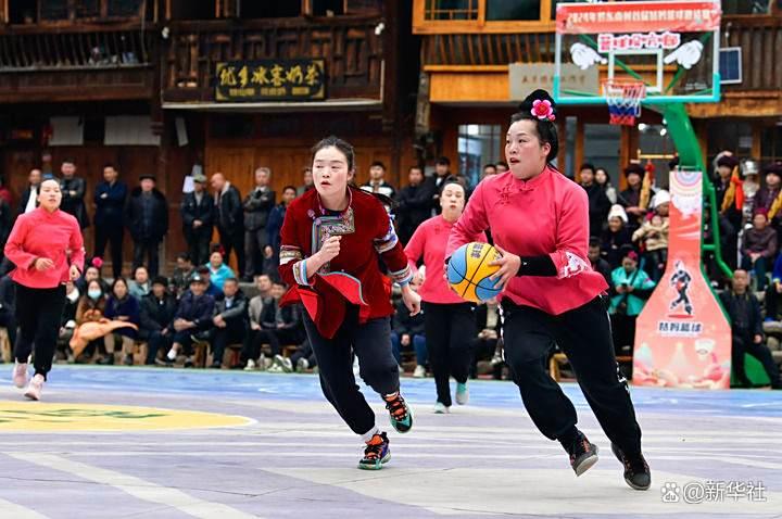 ↑2024年3月8日至10日,2024年黔东南州首届姑妈篮球邀请赛在贵州省黔东南苗族侗族自治州雷山县西江镇千户苗寨举行。比赛分为大众组和乡村组,共有来自黔东南州各县市的19支球队参赛。“姑妈篮球赛”主打欢乐、趣味,被群众戏称为“橄榄球式篮球”。这是台江县队球员(粉衣)与黎平县队球员在比赛中(2024年3月8日摄)。新华社记者 杨文斌 摄
