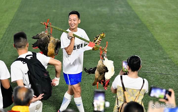 ↑2023年7月29日,在2023年“村超”总决赛颁奖仪式上,忠诚村足球队队长董永恒展示获得的最佳射手金靴奖杯和奖品——榕江小香鸡。 新华社记者 杨文斌 摄
