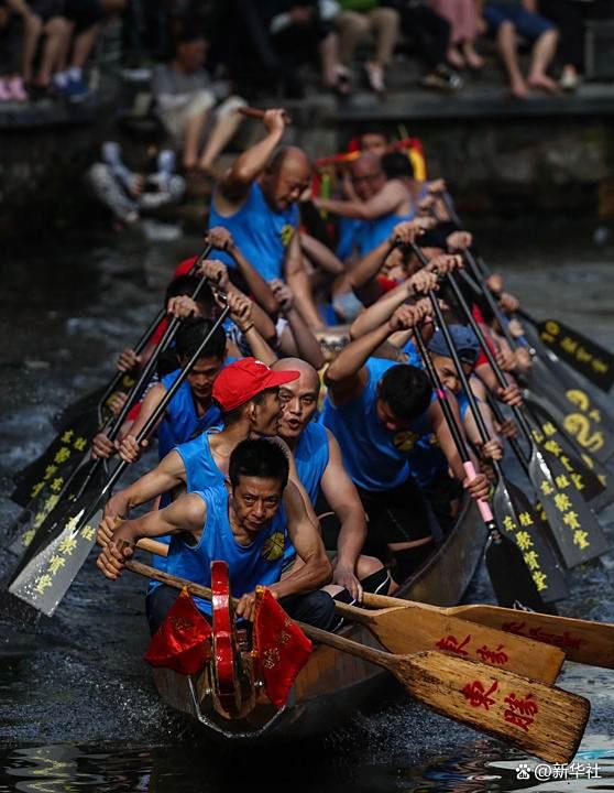 ↑2023年6月22日,“扒仔”(桨手)在佛山叠滘端午龙船漂移赛奋力挥桨,而舵手则稳坐在船头船尾。 极速“丝滑”过弯、甩尾过“考石角”、一鼓过三弯、击鼓论英雄……叠滘龙船漂移“狂飙”这个端午。 佛山叠滘水乡河道狭窄而蜿蜒,利用得天独厚的地形,数百年来,叠滘村民都在这样的河涌上扒龙船。如今,叠滘龙船比赛速度有了质的飞跃,快速入弯后留下水痕,速度和入弯线路形成了类似赛车的漂移,开创了弯道竞速、水上漂移的龙船扒法。“龙船漂移”成为叠滘龙船赛的专有名词。 每年端午,这里都会举办观赏性极强的龙船漂移赛。在叠滘龙船漂移赛事中,25米龙船需要满载三四十人在狭窄河道上漂移过弯,场面宛如特技漂移大赛。 新华社记者 刘大伟 摄