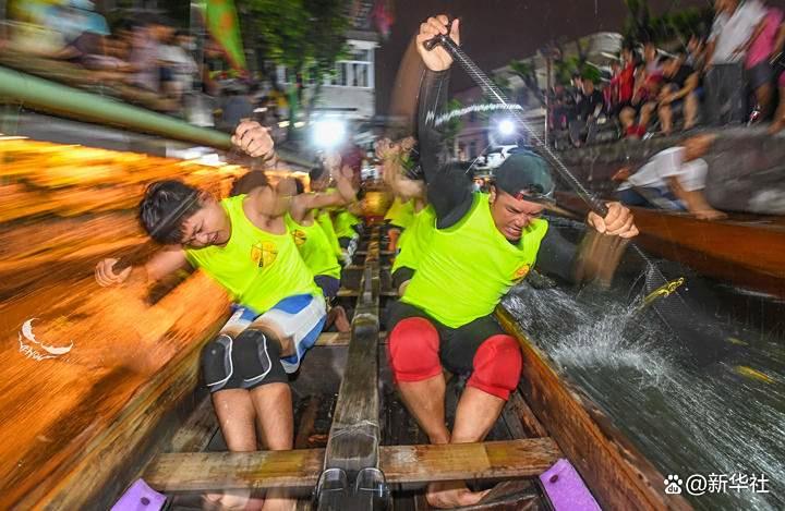 ↑2023年6月16日,佛山叠滘东胜村的“扒仔”(桨手)在端午前坚持每天夜晚训练,以求能在端午龙船漂移赛中展示最佳状态。新华社记者 刘大伟 摄