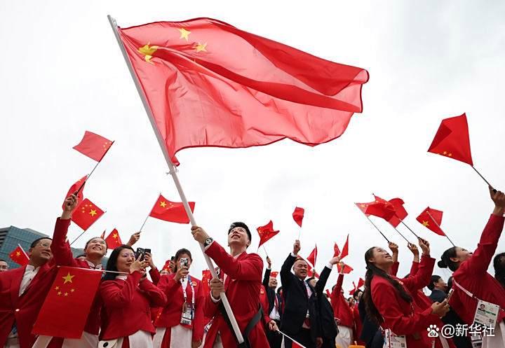 ↑2024年7月26日,中国体育代表团旗手、乒乓球选手马龙在巴黎奥运会开幕式前挥舞国旗。 新华社记者 曹灿摄