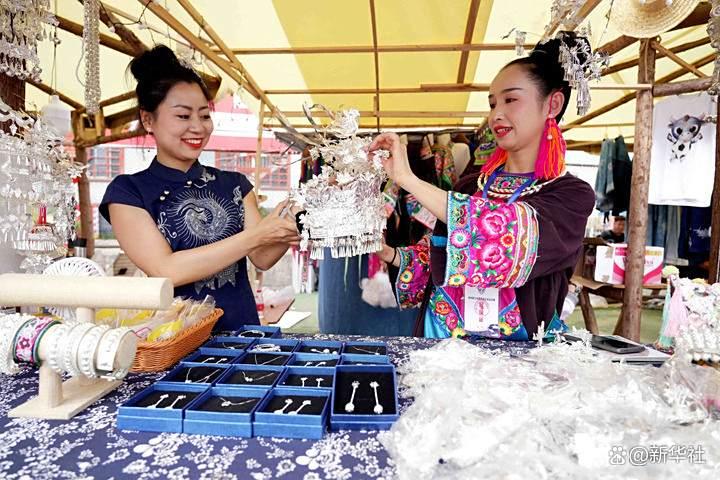 ↑2023年8月13日,当地群众在球场旁销售民族特色银饰。 当日,贵州榕江美食足球友谊赛(第一季)在贵州省榕江县开打。作为“村超”足球赛的延续,来自全国各地的近300支球队将在展示球技的同时推广当地美食文化。 新华社发(王炳真 摄)