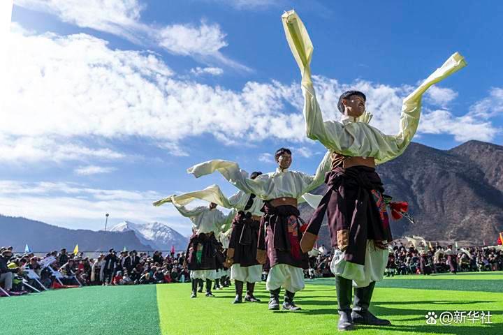 ↑2025年1月2日,人们在西藏昌都市洛隆县马利镇“云中球场”举行的村超足球友谊邀请赛开幕式上表演。新华社记者 丁增尼达 摄