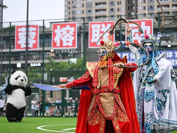 ↑2024年7月10日,来成都交流的贵州榕江“村超”文旅队与成都体投队足球交流赛在成都西村大院举行,这是川剧演员在比赛间隙表演变脸。绿茵场上运动员激烈角逐,来自两地的演员也带来了特色民俗文化表演,让观众在快乐、轻松的氛围中感受足球运动的魅力。 新华社记者 王曦 摄