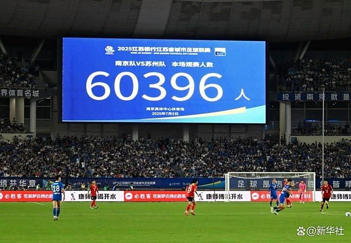 ↑2025年7月5日,在2025江苏省城市足球联赛第六轮比赛中,南京队主场迎战苏州队,球场大屏显示本场比赛共有60396名观众到场观赛,打破江苏省城市足球联赛单场上座纪录。 新华社记者 季春鹏 摄