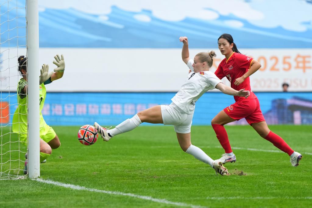 9月27日,上海体育大学女足球员尹丽红(左二)在比赛中射门得分。新华社记者 郑焕松 摄下半场