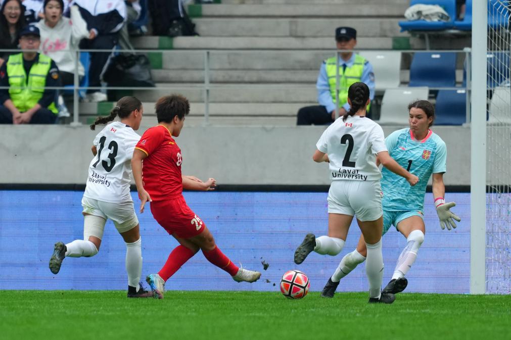 9月27日,拉瓦尔大学女足球员(中)在比赛中破门。新华社记者 郑焕松 摄开场仅两分钟