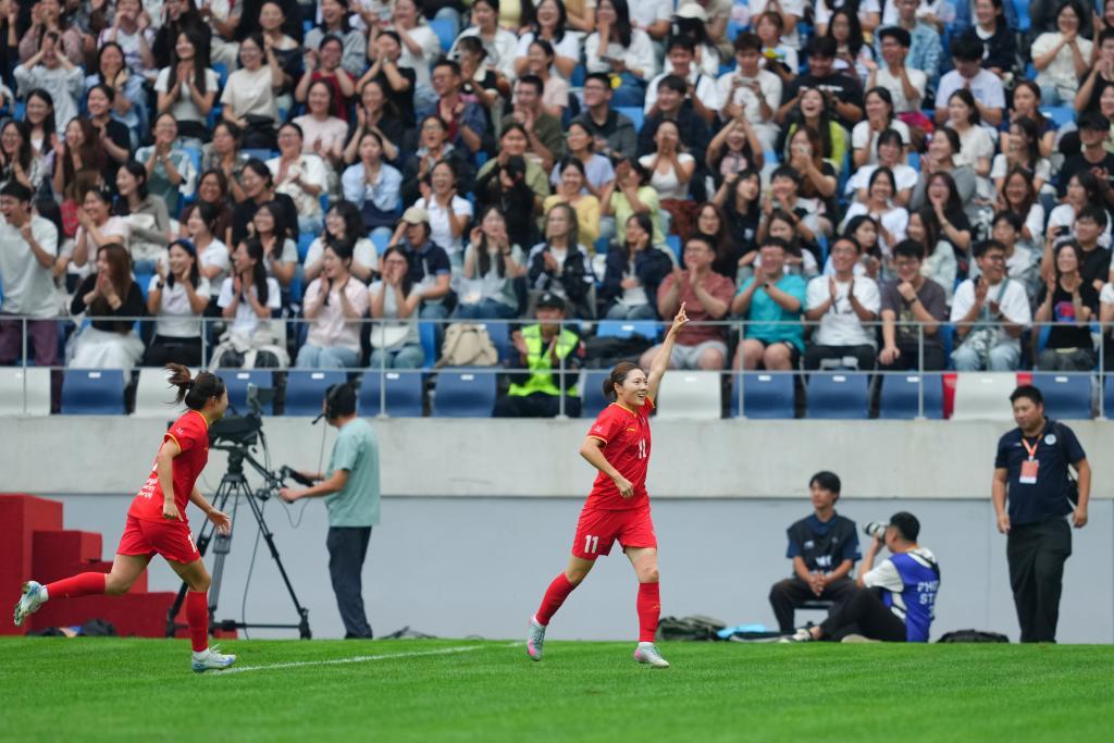 9月27日,上海体育大学女足球员尹丽红(右二)进球后与队友庆祝。新华社记者 郑焕松 摄是不是后悔没能现场体验?