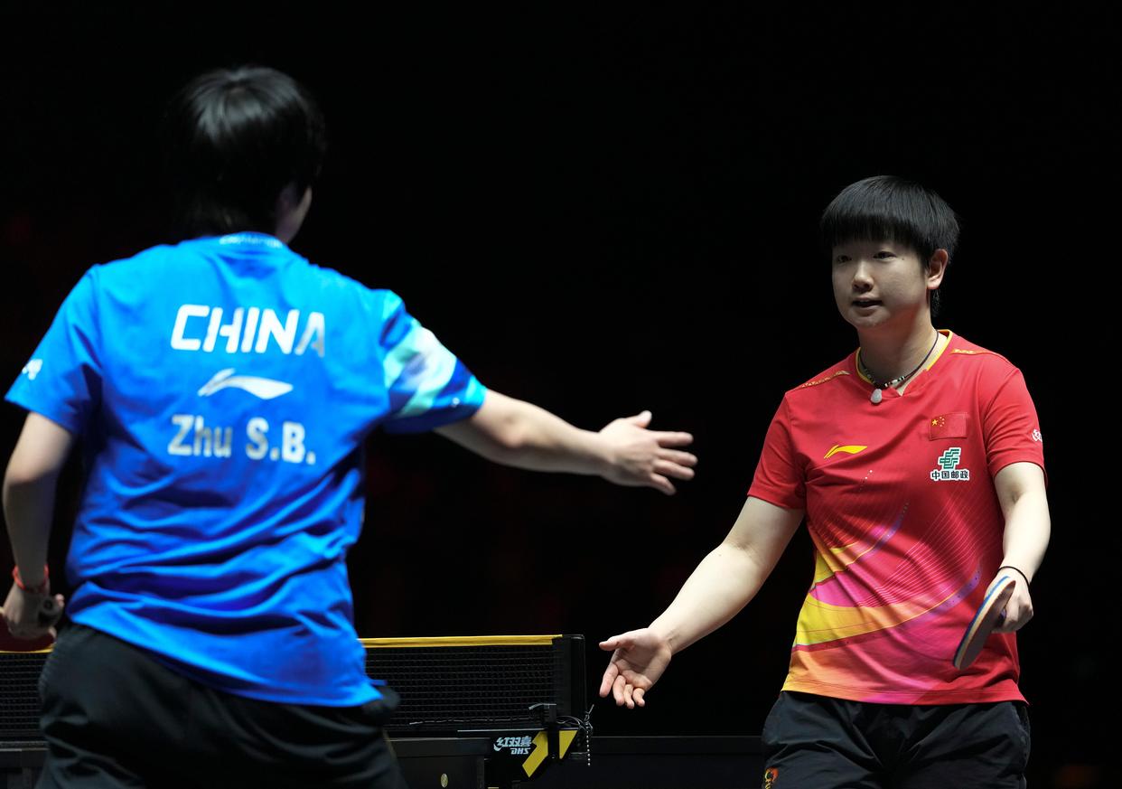 9月30日,孙颖莎(右)在比赛后和队友朱思冰致意。新华社记者 孙非 摄