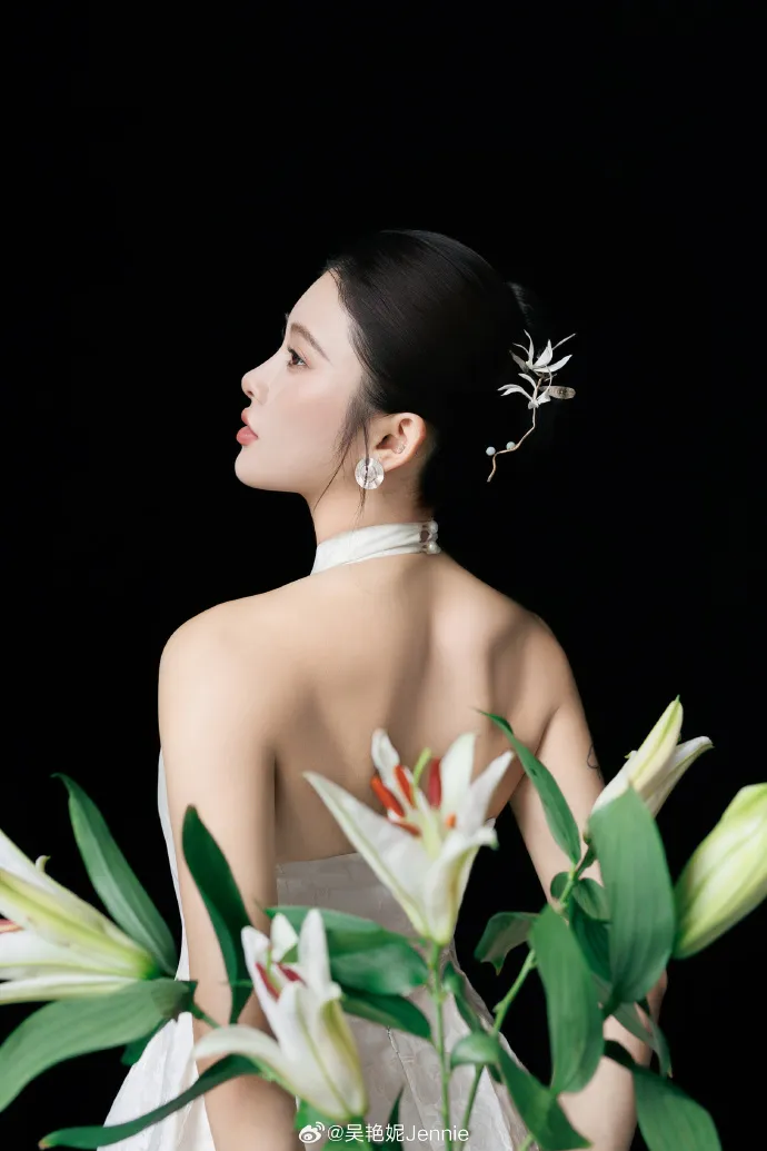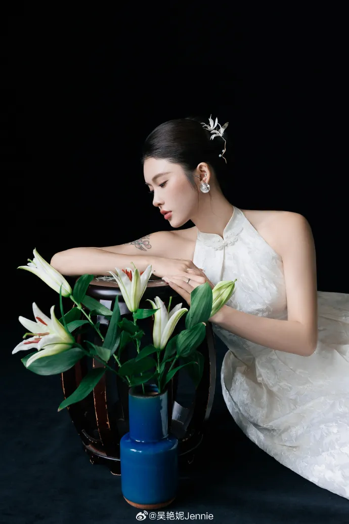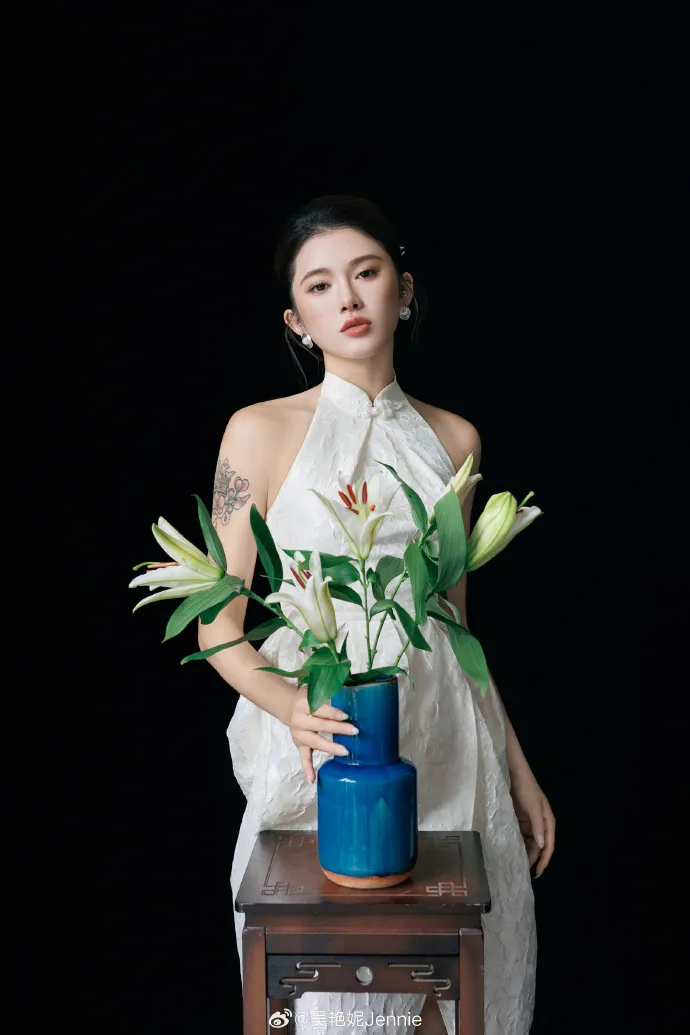 照片中,吴艳妮身穿新中式风格服装,展现出温婉大气的一面,与赛场上霸气十足的形象形成鲜明反差。