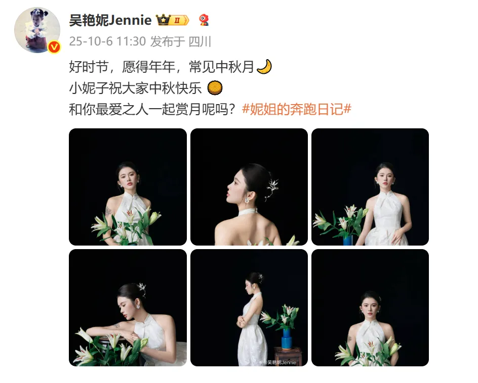 10月6日,运动员吴艳妮发文:“好时节,愿得年年,常见中秋月 小妮子祝大家中秋快乐 和你最爱之人一起赏月呢吗?”并晒出一组中国风写真。