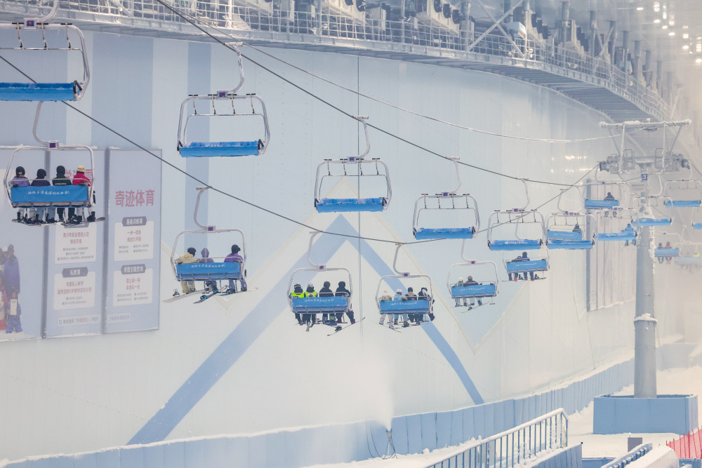 10月7日,滑雪爱好者在深圳·前海冰雪世界乘坐缆车。新华社记者 梁旭 摄
