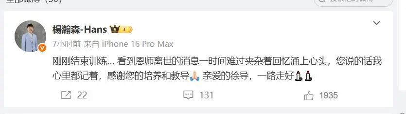 杨瀚森缅怀恩师(图源:@杨瀚森微博)