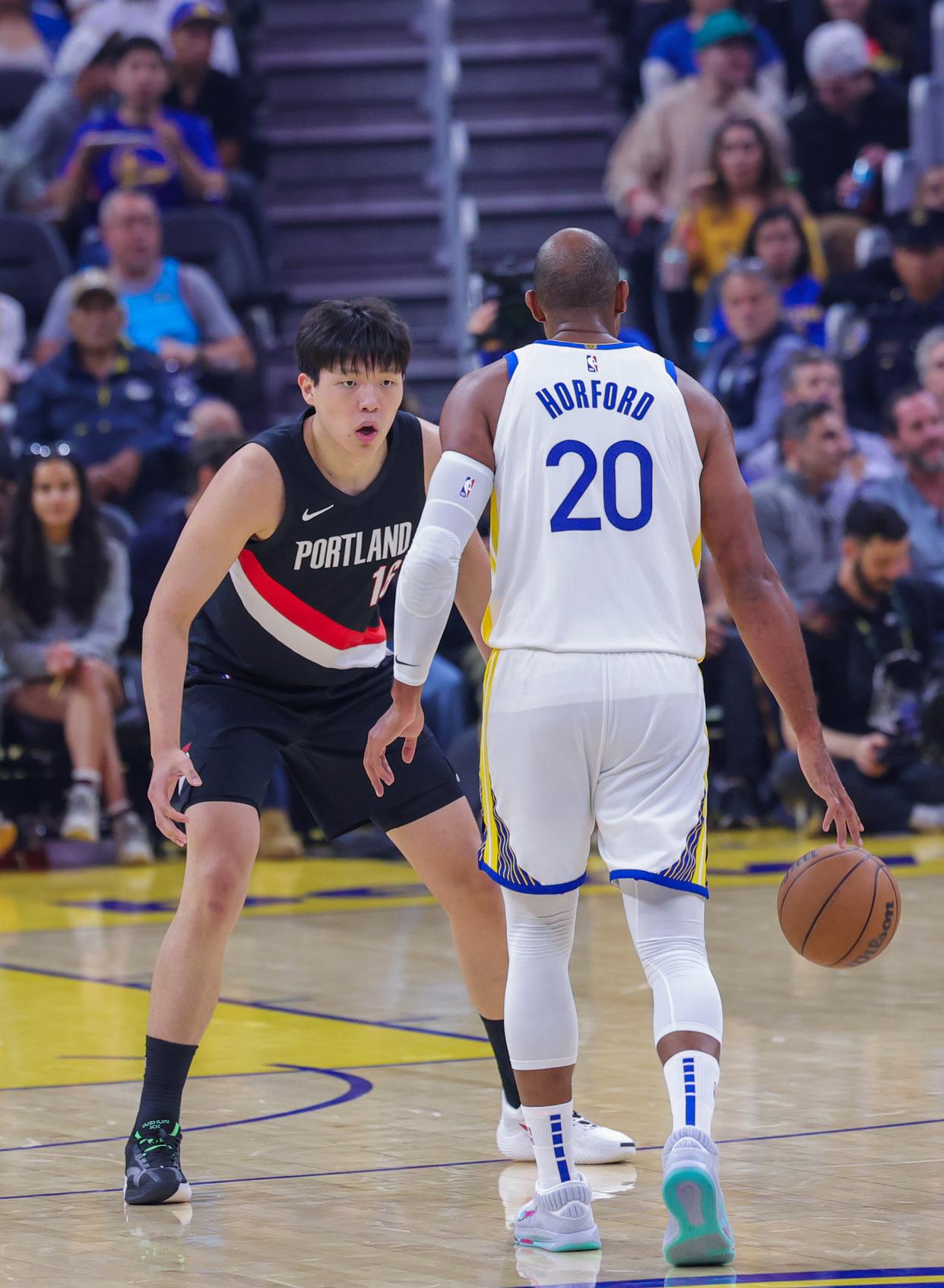 10月8日,开拓者队球员杨瀚森(左)在比赛中防守。新华社发(董旭东摄)