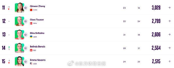 11-15:郑钦文3028、陶森2789、斯维托丽娜2606、本西奇2564、纳瓦罗2515