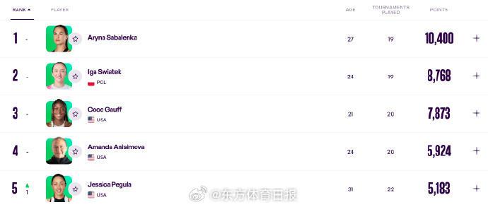 1-5:萨巴伦卡10400、斯瓦泰克8768、高芙7873、阿尼西莫娃5924、佩古拉5183
