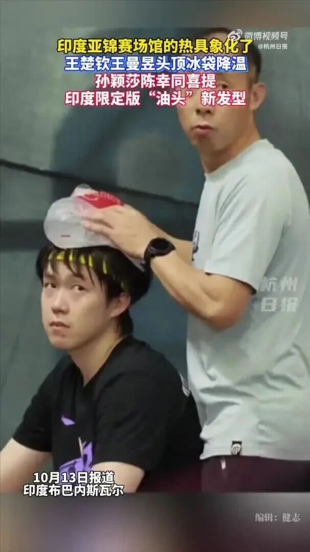 据悉,训练间隙,国乒队员王楚钦、林诗栋、王曼昱只能头顶冰袋降温,日本队则在局间休息时疯狂扇扇子。