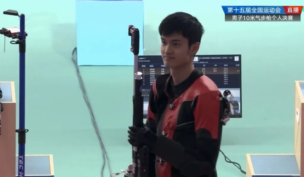 下午一点半,第十五届全运会射击男子10米气步枪个人决赛在广东射击中心打响,8位射击高手展开激烈角逐,苏州小伙盛李豪代表江苏队出战。
