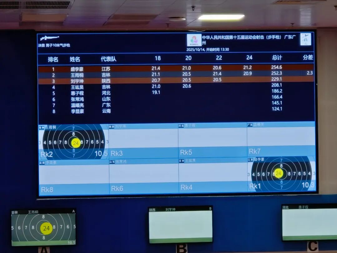 在扣人心弦的比赛中,盛李豪连续打出10.9环、10.8环等高分,逐渐将优势拉大。当最后一枪、也就是第24枪结束,冠军终于揭晓,盛李豪以254.6环,领先第二名2.3环的成绩,稳稳地将十五运会男子10米气步枪个人金牌收入囊中,这也是江苏体育代表团在本届全运会竞技比赛中斩获的第三枚金牌。