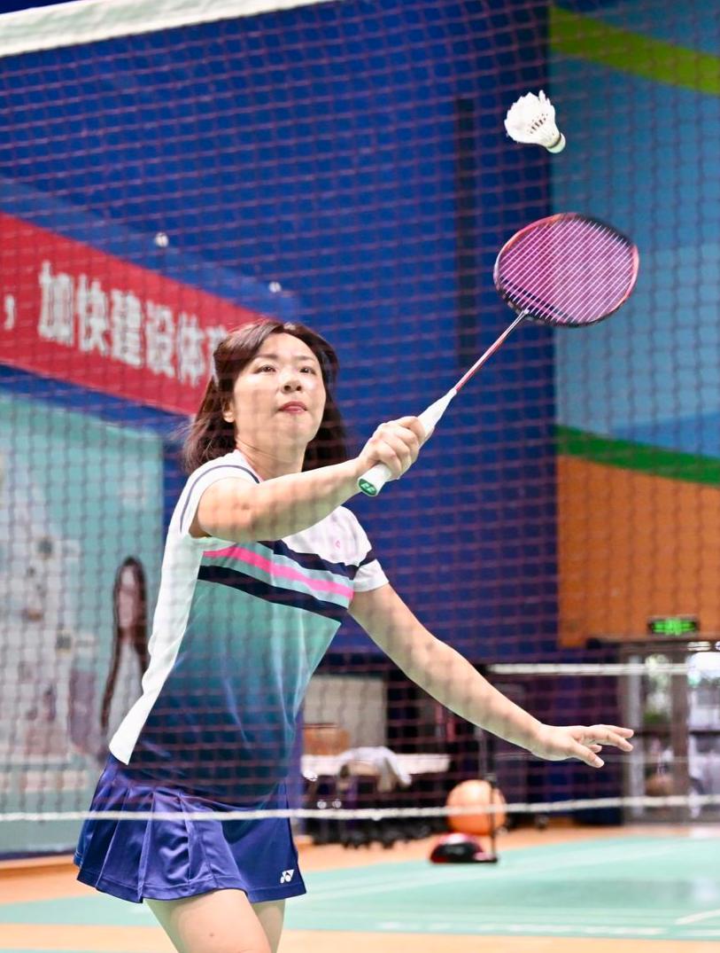 在训练馆内,多片场地的对抗训练同时开始,击球声和鞋底摩擦地板的声音交织,构成悦耳的“运动交响曲”。在女双的对抗场地上,一位身着红色训练服的大姐十分引人注目。她虽然身材不高,但脚步灵活、跳杀威猛,很明显功力深厚。多拍相持后,大姐一记“劈吊”终结了这个回合的较量,“邱姐,好球!”围观的队友们高声欢呼起来。