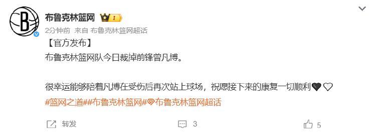 10月15日,据布鲁克林篮网官方微博消息:布鲁克林篮网队今日裁掉前锋曾凡博。