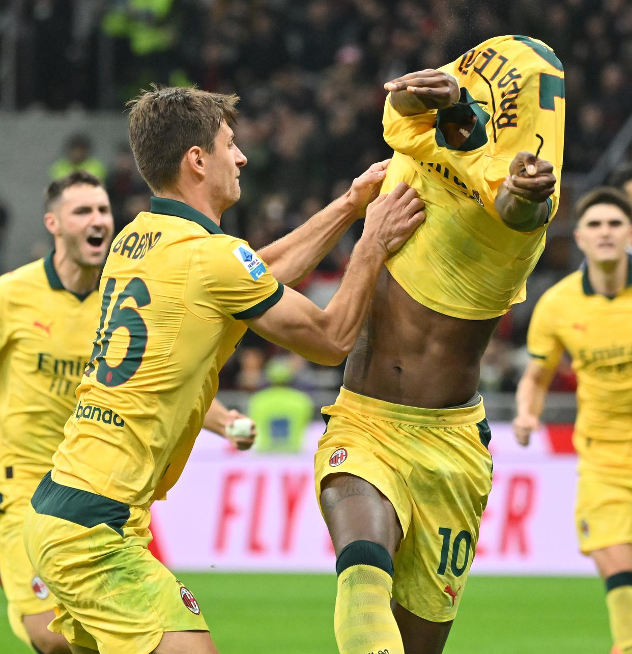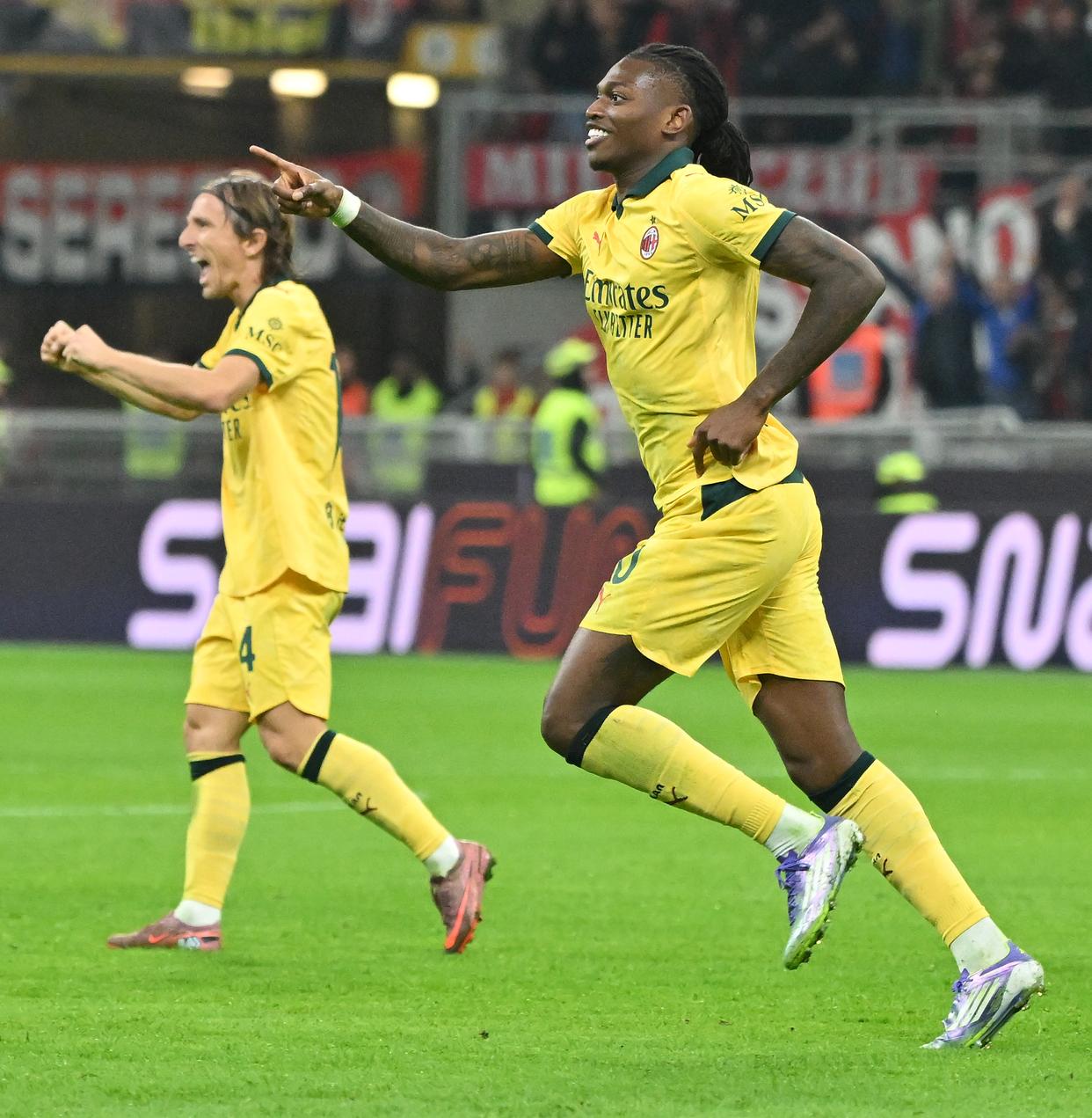 10月19日,AC米兰队球员莱奥(右)在比赛中庆祝打入本场第二粒进球。新华社发(阿尔贝托·林格利亚摄)