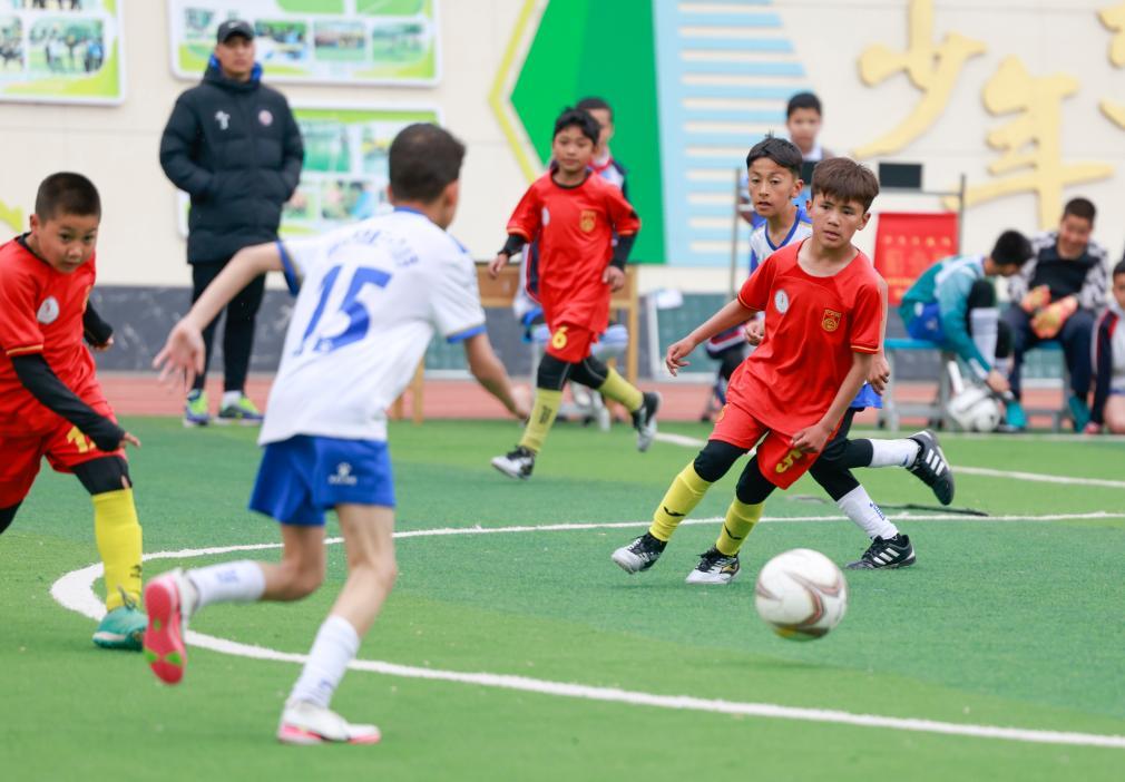 在乌鲁木齐市水磨沟区第五届中小学足球联赛中,乌鲁木齐市第121小学足球队队员(红衣)在比赛中(4月16日摄)。新华社记者 王菲 摄