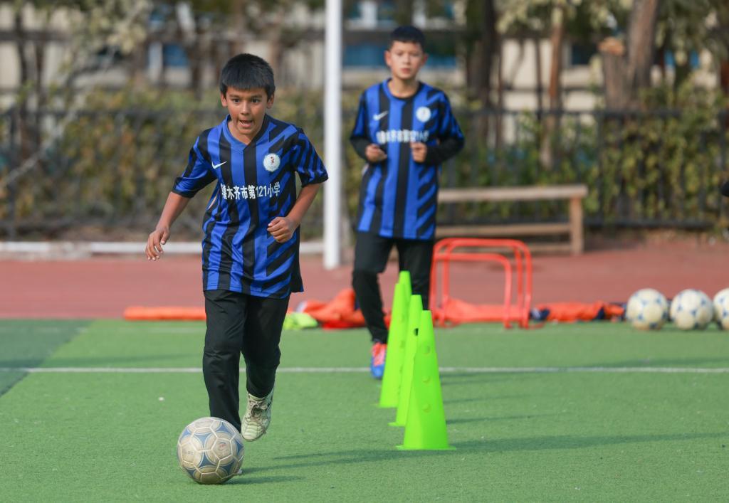 在乌鲁木齐市第121小学,足球队学生在进行日常训练(10月17日摄)。新华社记者 王菲 摄
