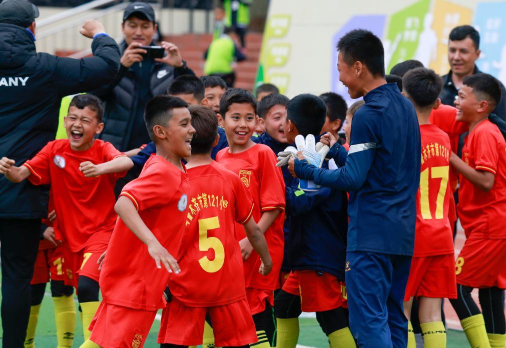 在乌鲁木齐市水磨沟区第五届中小学足球联赛中,乌鲁木齐市第121小学足球队赢得比赛后庆祝(4月16日摄)。新华社记者 王菲 摄