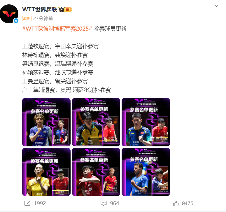 10月21日,据@WTT世界乒联 :WTT蒙彼利埃冠军赛2025参赛球员更新,国乒队员王楚钦、林诗栋、梁靖崑、孙颖莎和王曼昱退赛,分别由宇田幸矢、裴焕、温瑞博、池旼亨、曾尖递补参赛。中国队最终参赛名单为,男单:向鹏、陈垣宇、温瑞博,女单:陈幸同、蒯曼、王艺迪、陈熠。